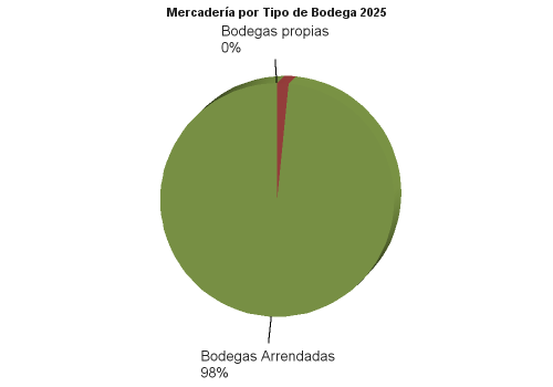| | | 2025 | 2024 | | MERCANCIAS ALMACENADAS | 752,881.27 | 493,691.87 | | Bodegas propias | 0.00 | 0.00 | | Mercaderías en Depósito Financiero | 0.00 | 0.00 | | Mercaderías en Depósito Fiscal | 0.00 | 0.00 | | Mercaderías en Depósito Simple | 0.00 | 0.00 | | | 0.00 | | Bodegas Arrendadas Directas | 11,881.32 | 0.00 | | Mercaderías en Depósito Financiero | 1,352.10 | 0.00 | | Mercaderías en Depósito Fiscal | 0.00 | 0.00 | | Mercaderías en Depósito Simple | 10,529.21 | 0.00 | | | 0.00 | | Bodegas Arrendadas | 740,999.95 | 493,691.87 | | Mercaderías en Depósito Financiero | 626,535.77 | 403,107.82 | | Mercaderías en Depósito Fiscal | 0.00 | 0.00 | | Mercaderías en Depósito Corriente | 114,464.18 | 90,584.04 | | | 0.00 | | Bodegas Habilitadas | 0.00 | 0.00 | | Mercaderías en Depósito Financiero | 0.00 | 0.00 | | Mercaderías en Depósito Corriente | 0.00 | 0.00 | | | 0.00 | | SEGUROS | 2,547,685.10 | 1,571,705.07 | | Seguros contratados | 2,547,685.10 | 1,571,705.07 | | De mercadería | 2,437,347.16 | 1,471,306.82 | | De bienes inmuebles y muebles propios | 88,080.10 | 78,141.40 | | De bienes inmuebles y muebles ajenos | 0.00 | 0.00 | | Otros seguros | 22,257.84 | 22,256.84 | | FIANZAS | 0.00 | 0.00 | | Fianzas contratadas | 0.00 | 0.00 | | A favor de la Dirección General de Aduanas | 0.00 | 0.00 | | De fidelidad de funcionarios y empleados | 0.00 | 0.00 | | Otras fianzas | 0.00 | 0.00 |